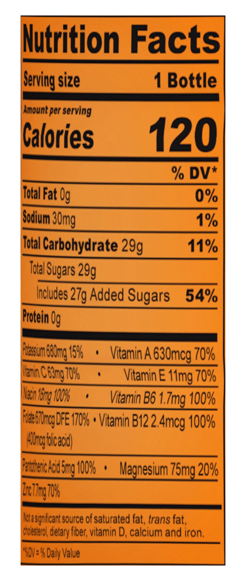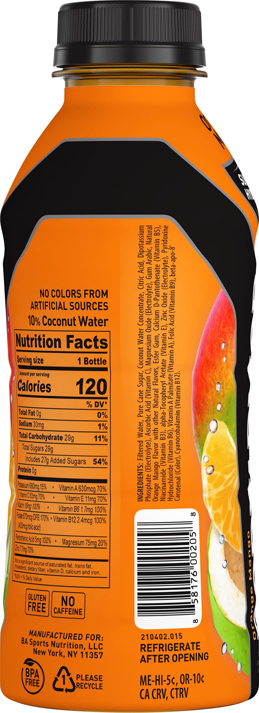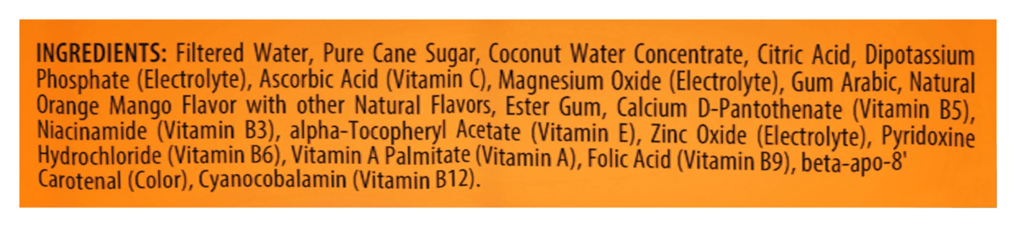 Ingredients: Filtered Water, Pure Cane Sugar, Coconut Water Concentrate, Citric Acid, Dipotassium Phosphate (Electrolyte), Ascorbic Acid (Vitamin C), Magnesium Oxide (Electrolyte), Gum Arabic, Natural Orange Mango Flavor with Other Natural Flavors, Ester Gum, Calcium D-Pantothenate (Vitamin B5), Niacinamide (Vitamin B3), Alpha-Tocopheryl Acetate (Vitamin E), Zinc Oxide (Electrolyte), Pyridoxine Hydrochloride (Vitamin B6), Vitamin A Palmitate (Vitamin a), Folic Acid (Vitamin B9), Beta-Apo-8 Carotenal (Color), Cyanocobalamin (Vitamin B12) Contains: Tree Nuts, Coconuts