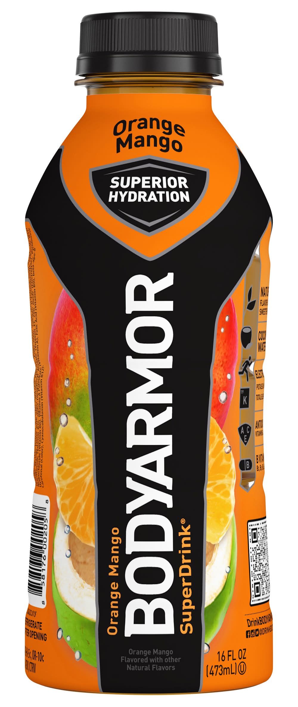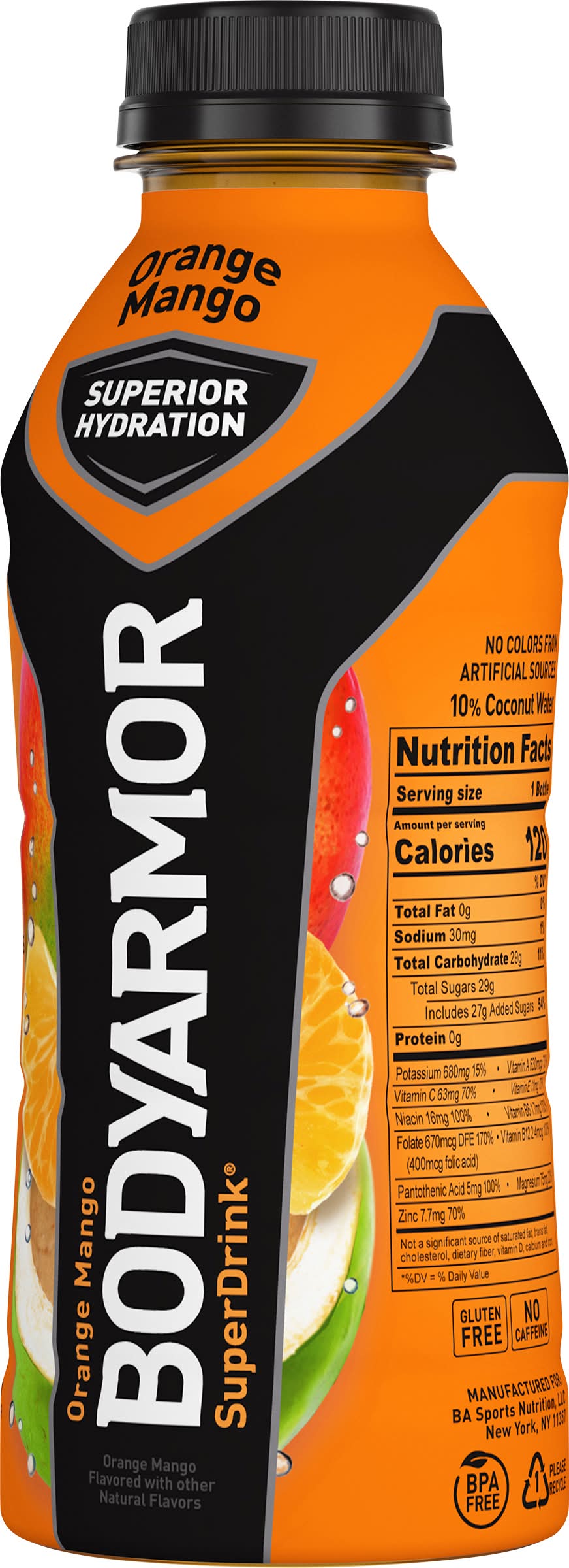 BODYARMOR Sports Drink Orange Mango isn't just any electrolyte drink; it's made with potassium-packed electrolytes and antioxidants. It's the real hydration you need to face any challenge. No artificial sweeteners, flavors or dyes, just real hydration and a burst of delicious flavor.From pre-workout on, this hydrating sports drink is designed to help you take on your day. It's not just about quenching your thirst it's about supporting you with every gulp. BODYARMOR Sports Drinks are made with coconut water to boost flavor, making sure you stay refreshed and ready to crush your next challenge. This is the sports drink to help you achieve your goals.If you're serious about your performance and need a sports drink beverage that works as hard as you do, reach for BODYARMOR Sports Drink Orange Mango. It's the ultimate sports drink for athletes who demand the best from themselves. • Flavor: Orange mango • Packaging: Reusable