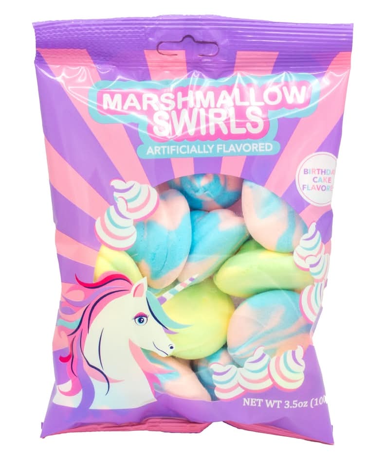 Craving a cute, fluffy, delicious treat? These marshmallow swirls are adorable and tasty. Perfect for enjoying right out of the bag, decorating cakes or cupcakes, or making rainbow smores! Flavor: Birthday cake