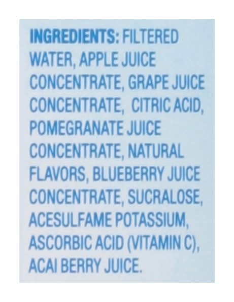 Ingredients: Filtered Water, Apple Juice Concentrate, Grape Juice Concentrate, Citric Acid, Pomegranate Juice Concentrate, Natural Flavors, Blueberry Juice Concentrate, Sucralose, Acesulfame Potassium, Ascorbic Acid (Vitamin C), Acai Berry Juice