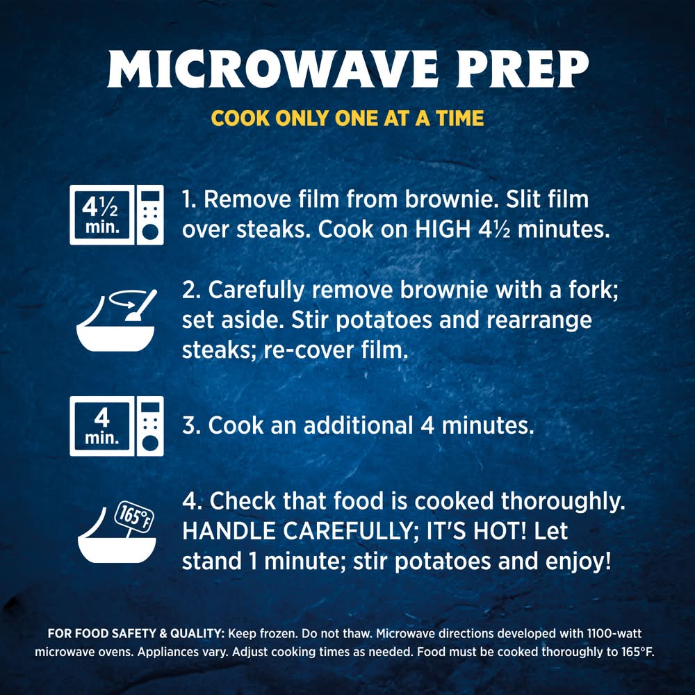 Directions for use: For Food Safety & Quality: Keep frozen. Do not thaw. Microwave directions developed with 1100-watt microwave ovens. Appliances vary. Adjust cooking times as needed. Food must be cooked thoroughly to 165 degrees F. Microwave Oven: Cook only one at a time. 1. Remove film from brownie. Slit film over steaks. Cook on high 4-1/2 minutes. 2. Carefully remove brownie with a fork; set aside. Stir potatoes and rearrange steaks; re-cover film. 3.Cook an additional 4 minutes. 4. Check that food is cooked thoroughly. Handle Carefully. Its hot! Let stand 1 minute; stir potatoes and enjoy! Conventional Oven: Do not prepare in toaster oven. Preheat oven to 350 degrees F. Remove film from brownie. Slit film over steaks. Cook on baking sheet in center of oven 40 to 45 minutes. Check that food is cooked thoroughly. Handle carefully; It's Hot! Let stand 2 minutes; stir potatoes and enjoy! Keep frozen. Best if used by. Storage recommendation: Keep frozen.