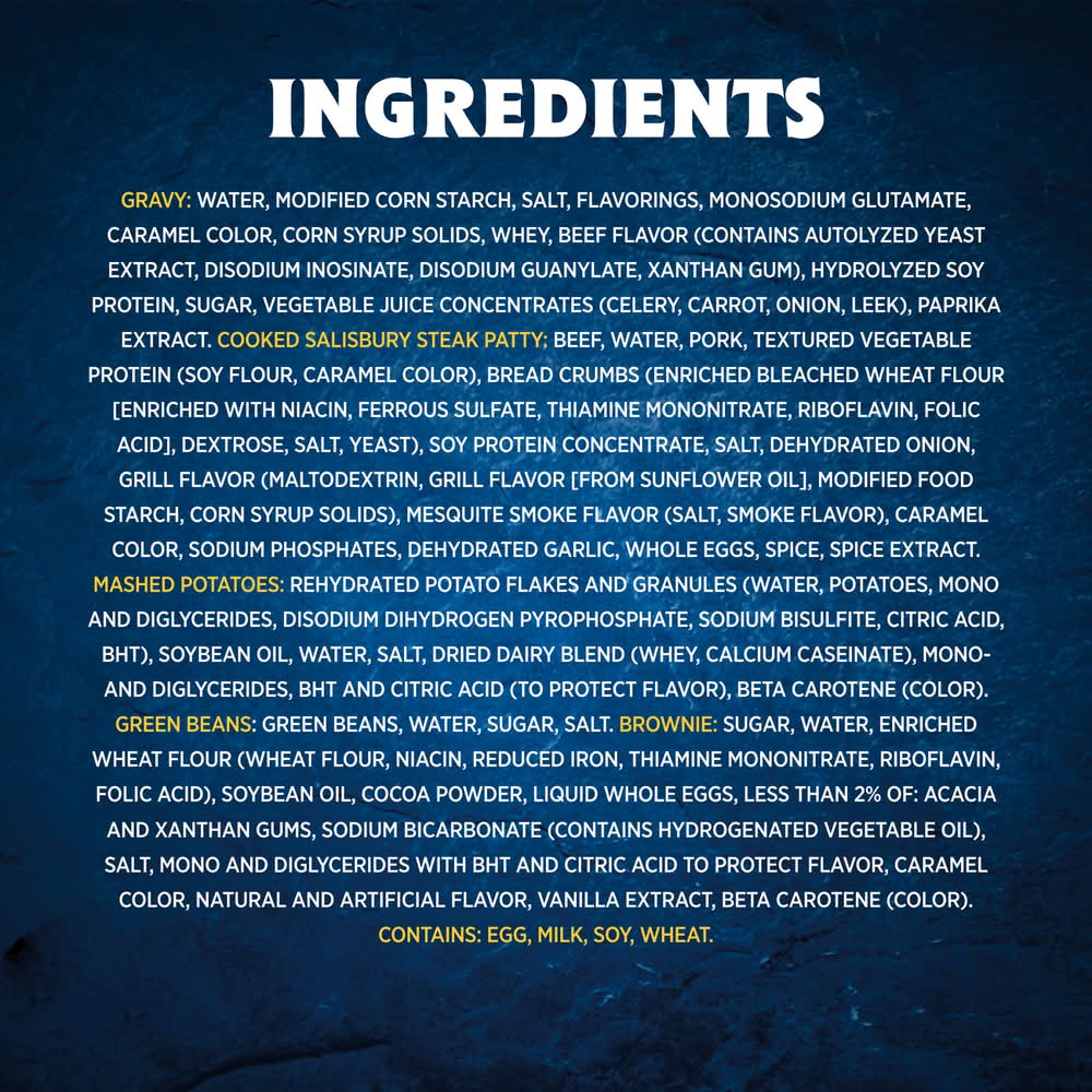 Ingredients: Gravy (Water Modified Corn Starch Salt Onion Powder Monosodium Glutamate Caramel Color Corn Syrup Solids Beef Base [Beef Flavor {Autolyzed Yeast Extract Disodium Inosinate and Disodium Guanylate Xanthan Gum} Salt Hydrolyzed Soy Protein Sugar Monosodium Glutamate Flavor Propylene Glycol Caramel Color Vegetable Juice Concentrates {Celery Carrot Onion and Leek} Extractives of Paprika] Whey Oleoresin, Cooked Salisbury Steak Patty (Beef Water Pork Textured Vegetable Protein [Soy Flour Caramel Color] Bread Crumbs [Enriched Bleached Wheat Flour {Enriched with Niacin Ferrous Sulfate Thiamine Mononitrate Riboflavin Folic Acid} Dextrose Salt Yeast] Soy Protein Concentrate Salt Dehydrated Onion Grill Flavor [Maltodextrin Grill Flavor {from Sunflower Oil} Modified Food Starch Corn Syrup Solids] Mesquit, Mashed Potatoes (Rehydrated Potato Flakes and Granules [Water Potatoes Mono and Diglycerides Sodium Acid Pyrophosphate Citric Acid Sodium Bisulfite & BHT] Seasoning Sauce [Soybean Oil Water Mono and Diglycerides with BHT and Citric Acid to Protect Flavor Beta-Carotene {Color}] Salt Dried Dairy Blend [Whey Calcium Caseinate]), Green Beans, Brownie (Sugar Water Enriched Wheat Flour [Wheat Flour Niacin Reduced Iron Thiamine Mononitrate Riboflavin Folic Acid] Soybean Oil Cocoa Powder Liquid Whole Eggs Seasoning Sauce [Soybean Oil Water Mono and Diglycerides with BHT and Citric Acid to Protect Flavor Beta-Carotene {Color}] Acacia and Xanthan Gums Sodium Bicarbonate [Hydrogenated Vegetable Oil] Salt Natural and Artificial Flavor [Contain, Seasoned Sauce [Water, Sugar, Salt] Contains: SOY, WHEAT, EGGS, MILK