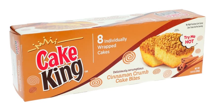 Feel like royalty with a delicious treat from Cake King(TM)! These individually wrapped snack cakes are great for lunches, school events, cafeterias, daycare snacks, and beyond. Featuring a soft and moist cake base with a crumbly cinnamon topping, they are sure to satisfy any palate. Try them straight out of the pack, or heat them up and pair them with a fresh coffee for a fast and easy breakfast that will fuel you for the day. Flavor: Cinnamon