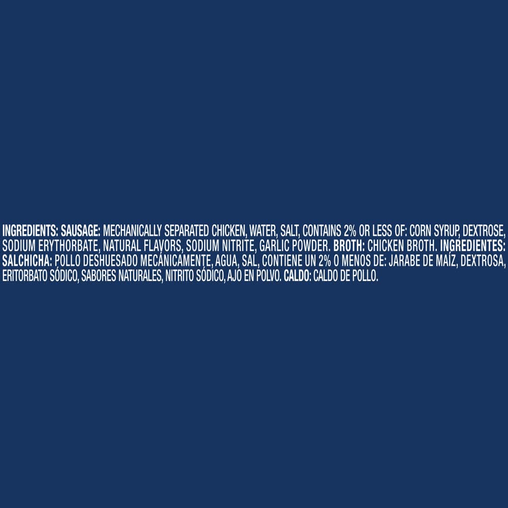 Ingredients: INGREDIENTS: SAUSAGE: MECHANICALLY SEPARATED CHICKEN, WATER, SALT. CONTAINS 2% OR LESS OF: CORN SYRUP, DEXTROSE, SODIUM ERYTHORBATE, NATURAL FLAVORS, SODIUM NITRITE, GARLIC POWDER. BROTH: CHICKEN BROTH.