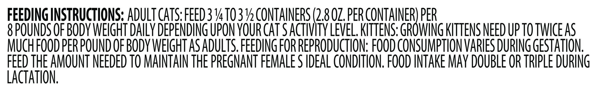 Feeding instructions: adult cats: feed 3-1/4 to 3-1/2 containers (2.8 oz per container) per 8 pounds of body weight daily depending upon your cat's activity level. kittens: growing kittens need up to twice as much food per pound of body weight as adults. feeding for reproduction: food consumption varies during gestation. feed the amount needed to maintain the pregnant female's ideal condition. food intake may double or triple during lactation. after opening, refrigerate and use within 3 days. be sure to provide plenty of fresh, clean water daily.
