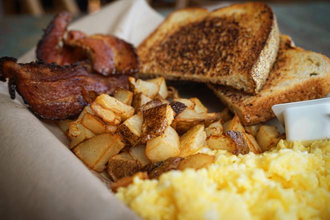 2 eggs + jalapeño bacon + jalapeño corn bread toast + fried potatoes + muenster cheese