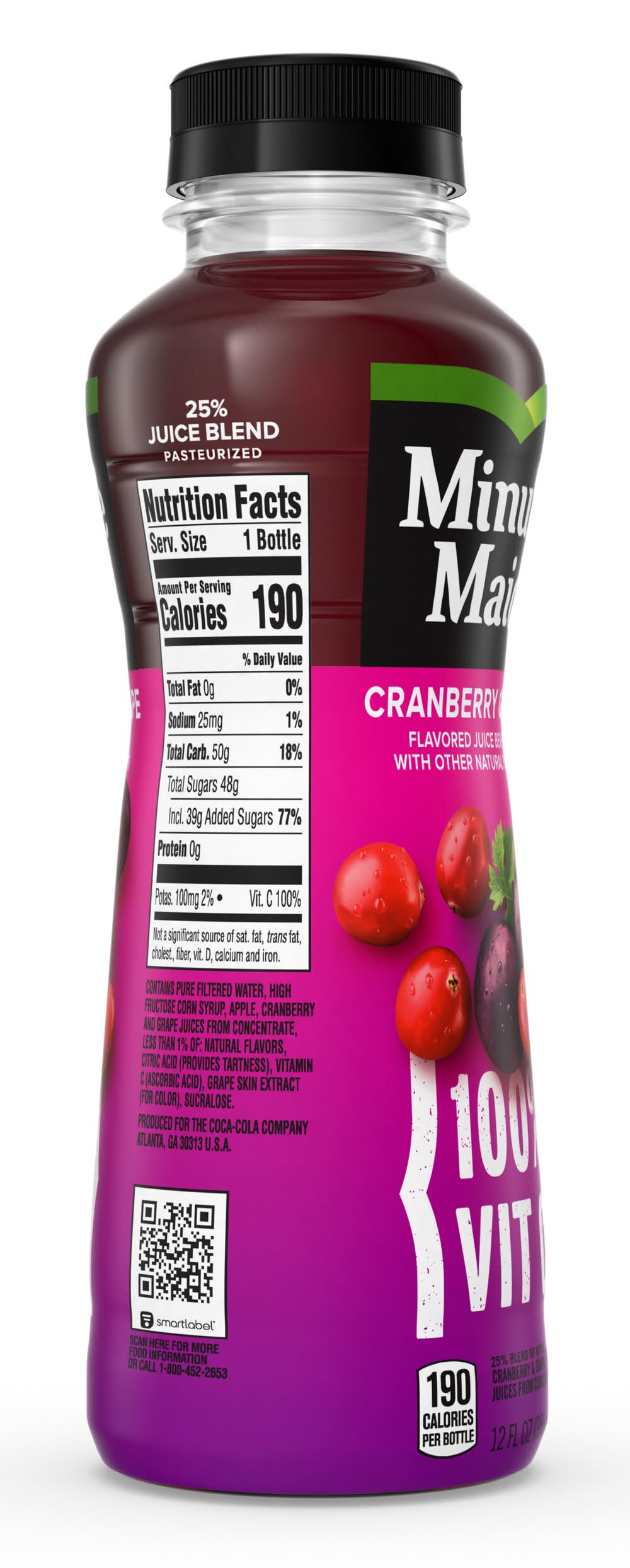 25% juice blend of apple, cranberry and grape juices from concentrate. Flavored juice beverage with other natural flavors. 190 calories per bottle. 100% Vit C. Pasteurized. Put good in. Get good out. • Flavor: Cranberry grape • The coca-cola company, Address Line 1:Atlanta,Address Line 2:GA,City:30313,State/Province: U.S.A. • Packaging: Reusable