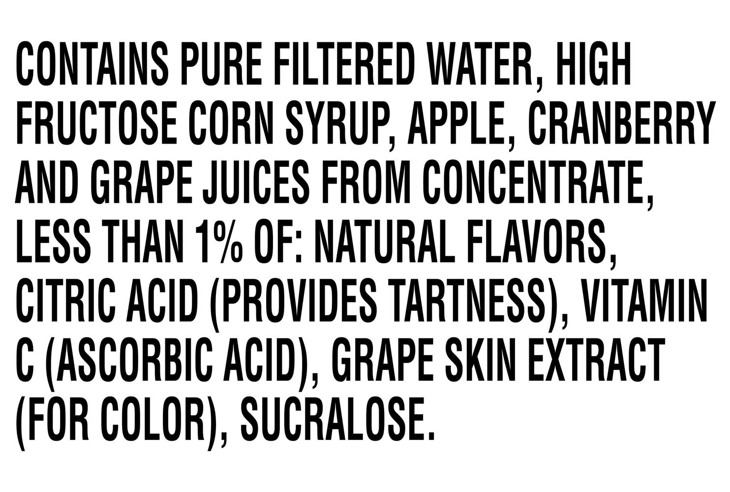 Ingredients: Pure Filtered Water, High Fructose Corn Syrup, Apple, Cranberry And Grape Juices From Concentrate, Less Than 1% Of: Natural Flavors, Citric Acid (Provides Tartness), Vitamin C (Ascorbic Acid), Grape Skin Extract (For Color), Sucralose.