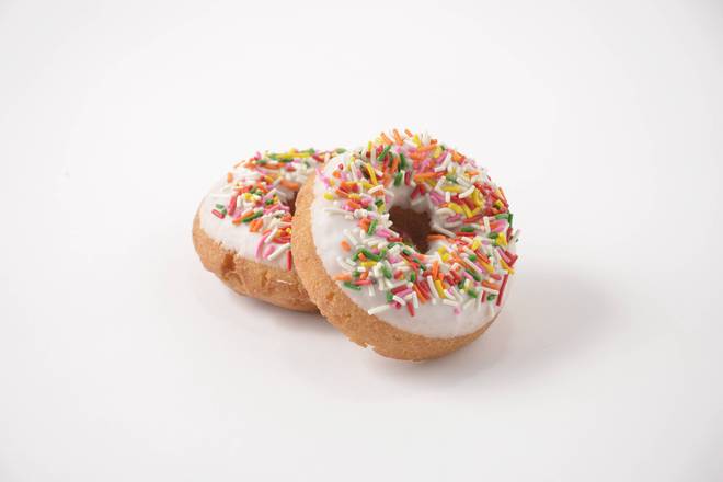 White cake donut coated in white frosting and adorned with rainbow sprinkles.