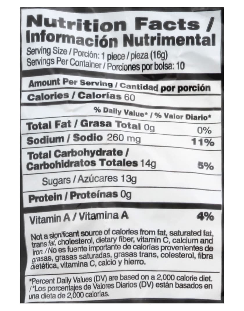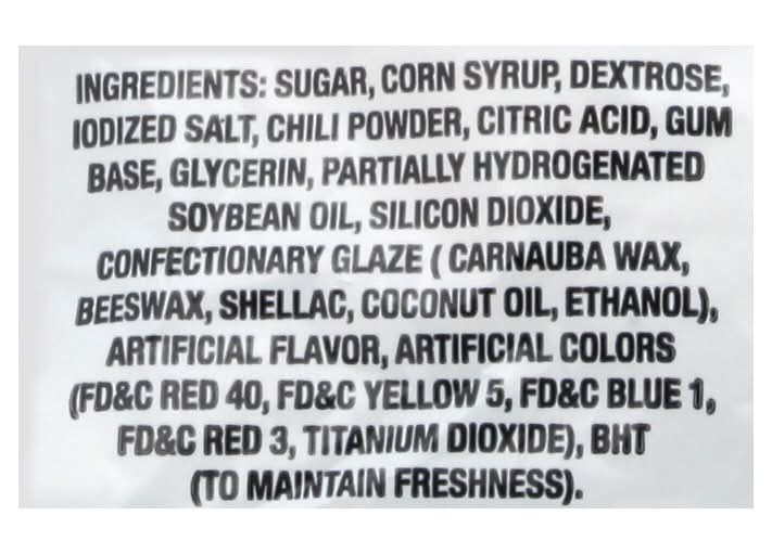 Ingredients: Sugar, Corn Syrup, Dextrose, Iodized Salt, Chili Powder, Citric Acid, Gum Base, Glycerin, Partially Hydrogenated Soybean Oil, Silicon Dioxide, Confectionary Glaze ( Carnauba Wax Beeswax Shellac Coconut Oil Ethanol), Artificial Flavor, Artificial Colors (FD&C Red 40 FD&C Yellow 5 FD&C Blue 1 FD&C Red 3 Titanium Dioxide), BHT (to Maintain Freshness) Contains: Soybeans, Tree Nuts