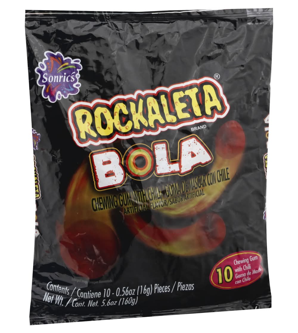 Chewing gum with chili. Artificial flavor. www.rockaleto.mx. www.Sonrics.com.mx.