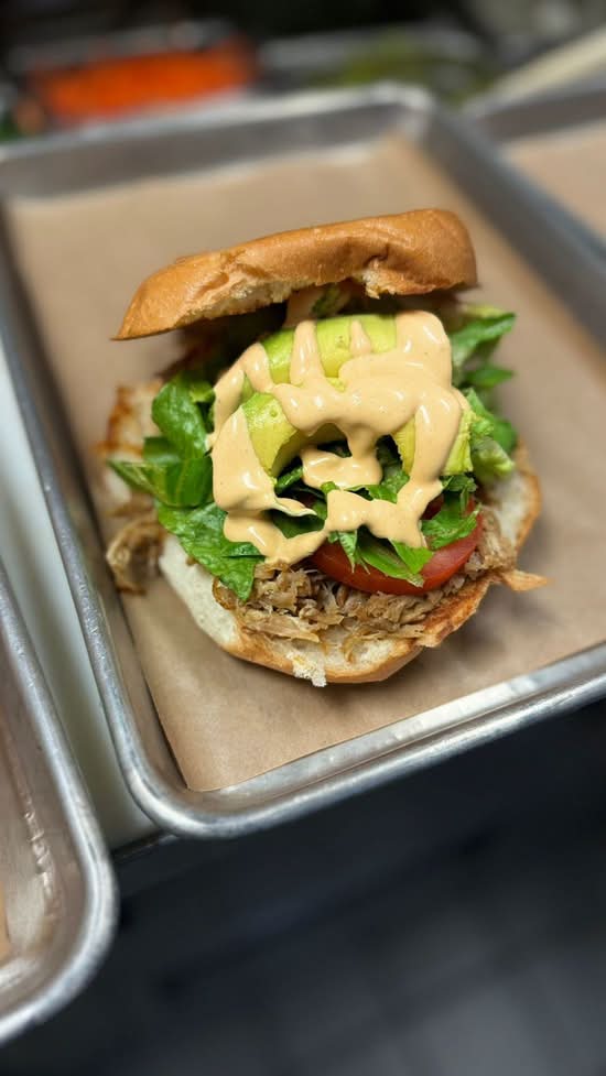 SHREDDED ANGUS BRISKET WITH LETTUCE, TOMATO, AVOCADO AND DRESSING ON A TOASTED BUN