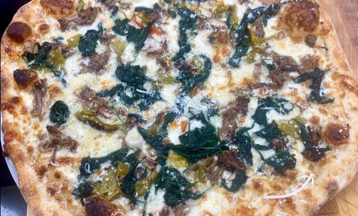 16" Crispy crust, slow roasted, garlic-rosemary pork loin, mozzarella, provolone, sliced long hots, garlic spinach, Romano...