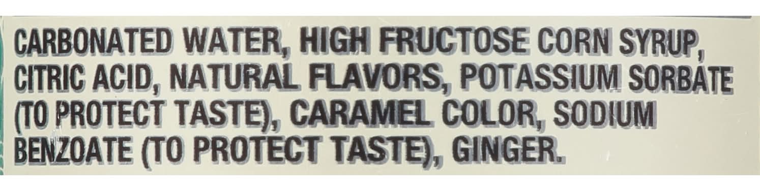 Ingredients: Carbonated Water, High Fructose Corn Syrup, Citric Acid, Ginger Extract With Other Natural Flavors, Potassium Sorbate (To Protect Taste), Caramel Color, Sodium Benzoate (To Protect Taste). Contains: Corn