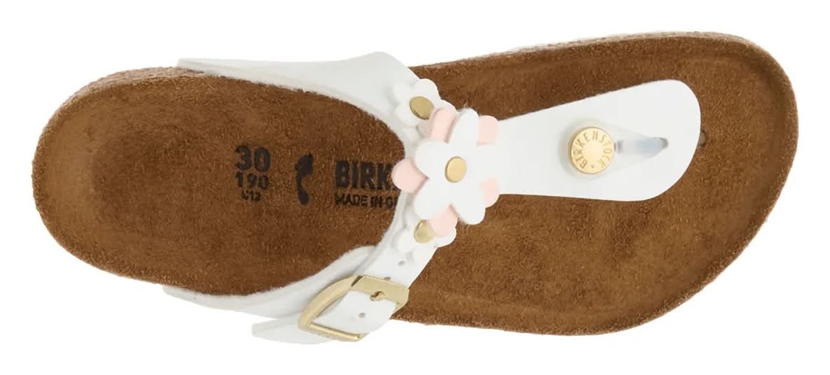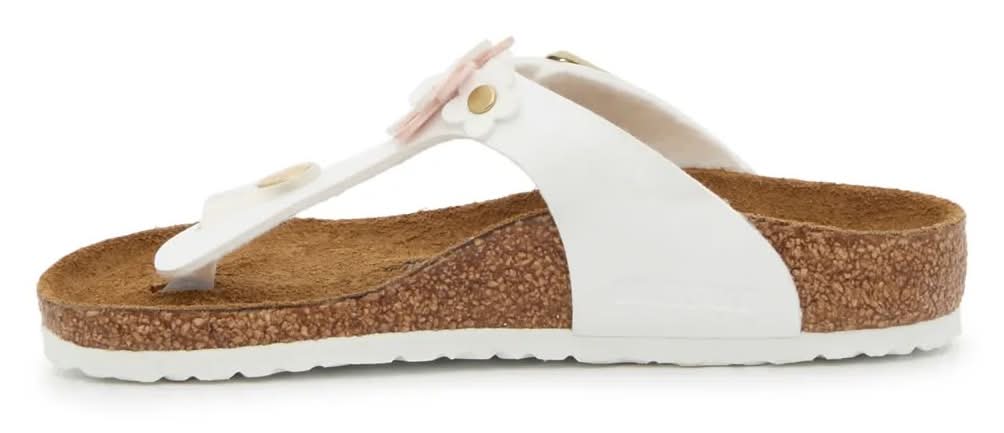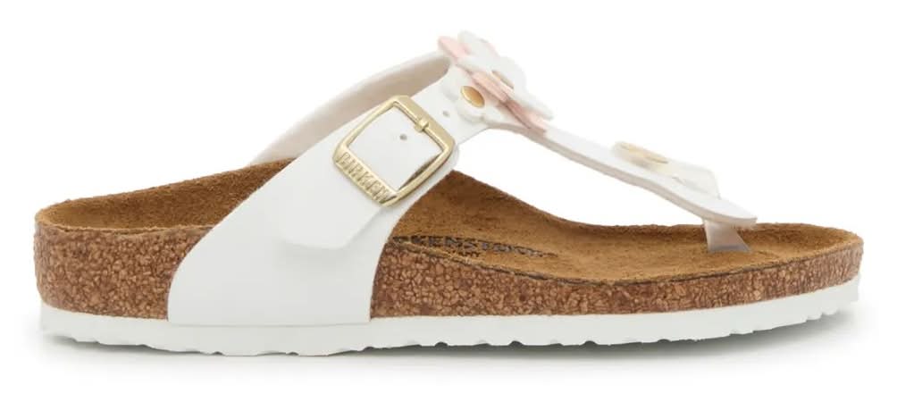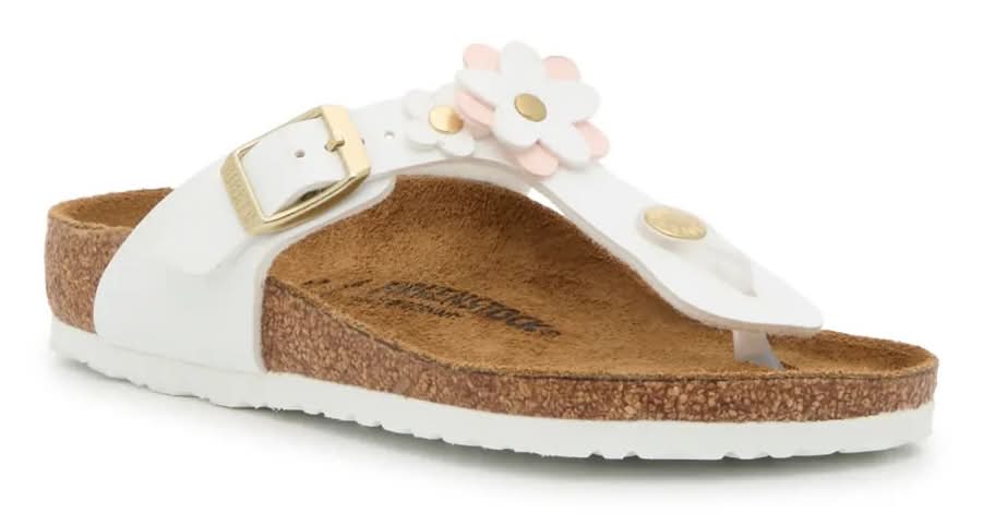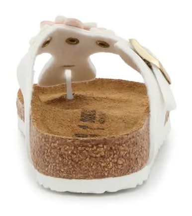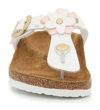 Add a fresh flair to your kiddo's steps with the Gizeh Flower sandals from Birkenstock. The casual flip flop-inspired silhouette is elevated by a sweet flower accent on the strap. Complete with an anatomically-shaped suede footbed and cushioned cork midsole to keep them comfortable all day long. Not sure which size to order? Click here to check out our Kids Measuring Guide! For more helpful tips and sizing FAQs, click here. • Color: White/pink • Size: Medium - EU 31 / US 13-13.5 Youth • female