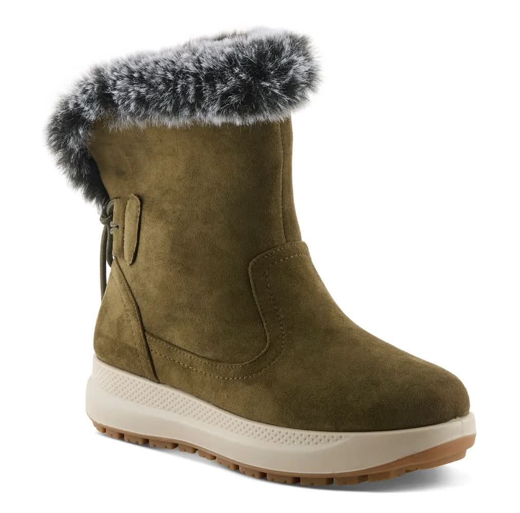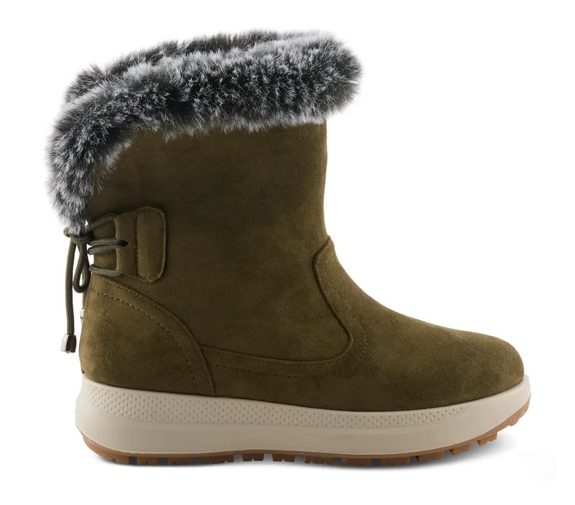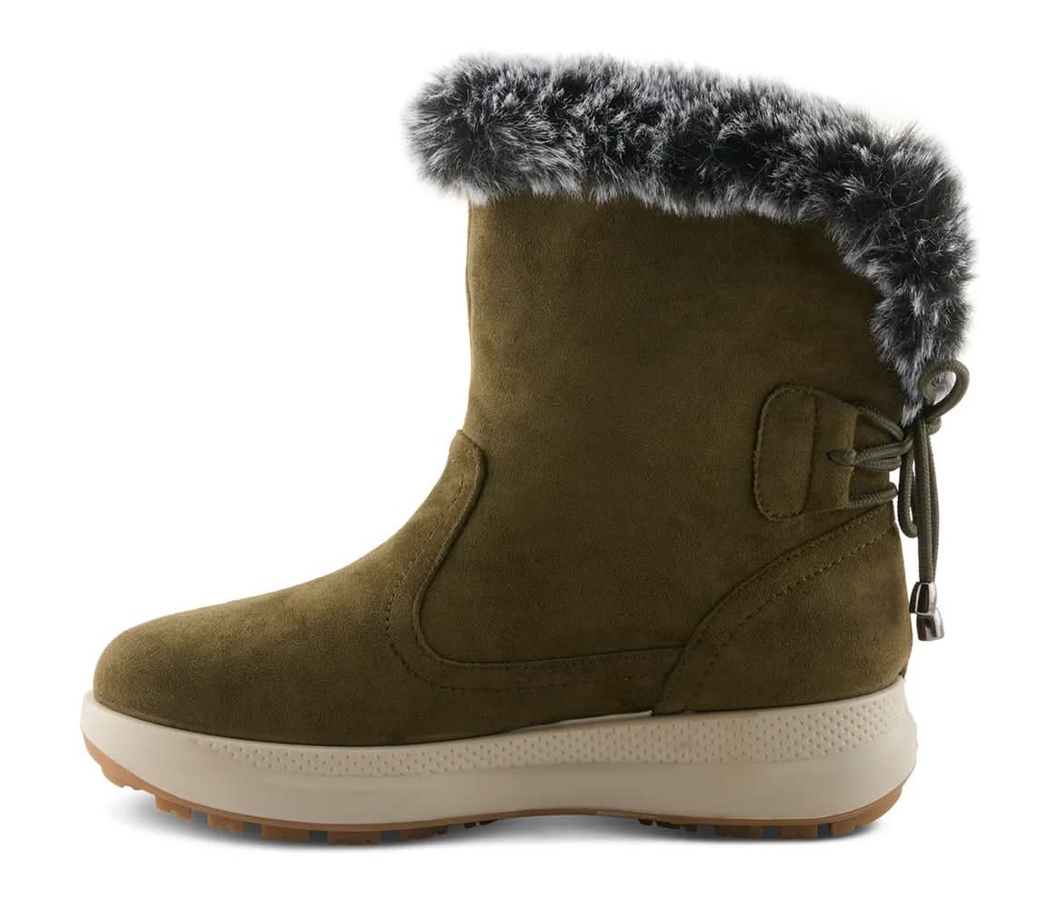The Aldaz bootie from Flexus proves that practicality and style go hand in hand. This waterproof boot wraps you in warmth and chic comfort, thanks to a plush faux fur cuff and soft fleece lining that feels like a hug for your feet. A decorative lace detail at the back adds a dash of wintry charm, while the flexible sole and padded insole make every step feel effortless.Click here for Boot Measuring Guide. • Color: Olive green • Size: Medium - 7 • female