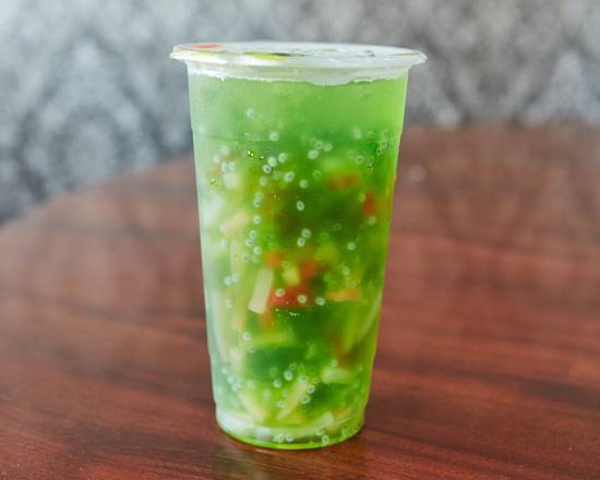 Our house special drink. A refreshing grass jelly drink with basil seeds and rainbow jelly.