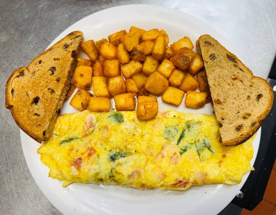 3 EGG OMELET W/ FRESH SPINACH, TOMATO, AND FETA. SERVED W/ HOMEFRIES AND TOAST