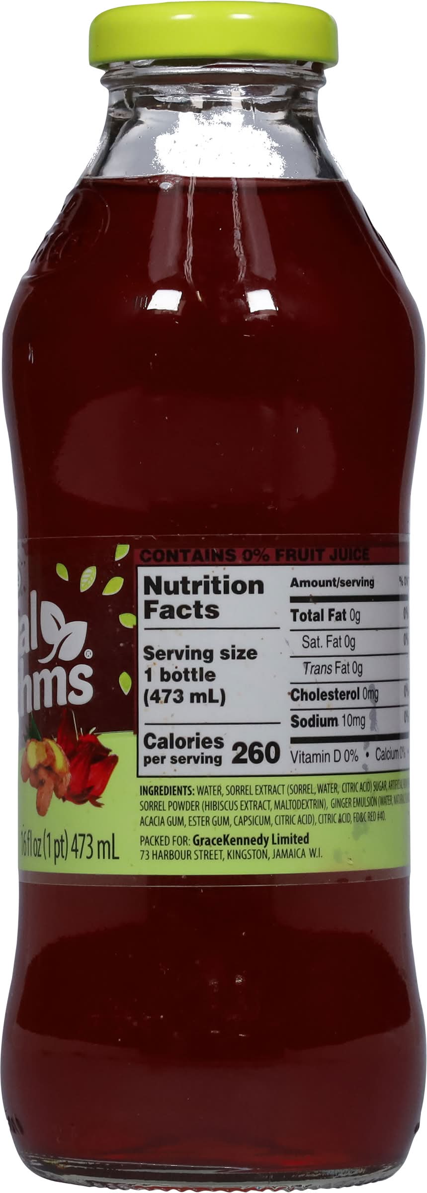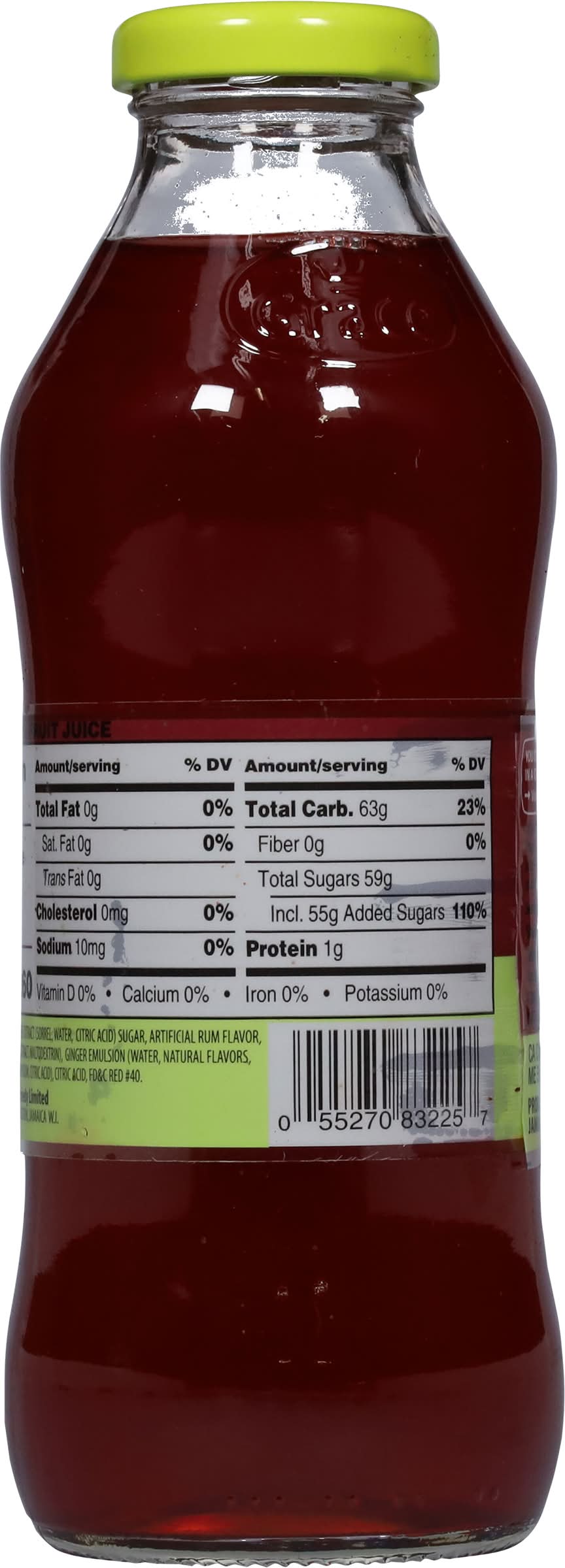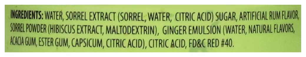 Ingredients: Water, Sorrel Extract (Sorrel, Water, Citric Acid) Sugar, Artificial Rum Flavor, Sorrel Powder (Hibiscus Extract, Maltodextrin), Ginger Emulsion (Water, Natural Flavors, Acacia Gum, Ester Gum, Capsicum, Citric Acid), Citric Acid, FD&C Red 40
