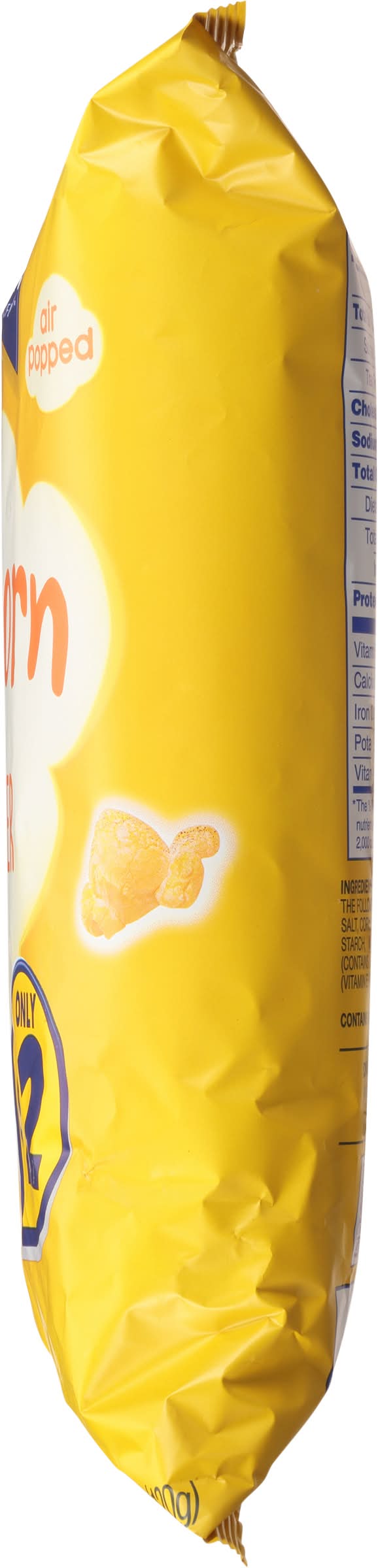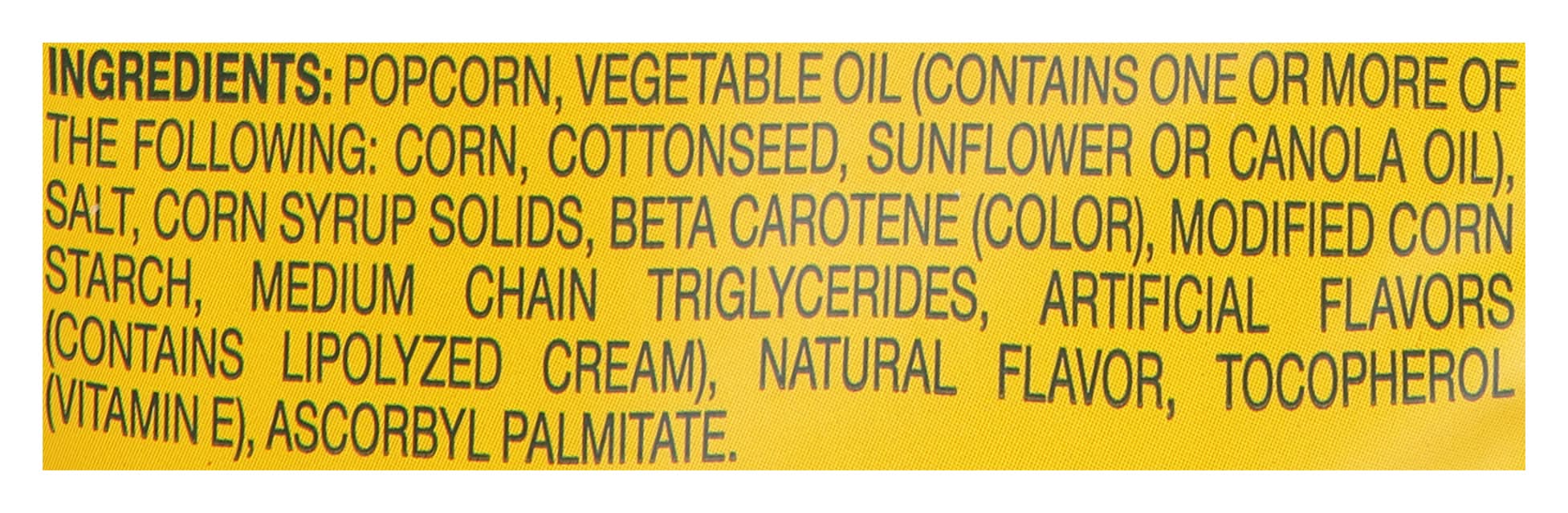Ingredients: Popcorn, Vegetable Oil (Contains One or More of the Following: Corn, Cottonseed, Sunflower or Canola Oil), Salt, Corn Syrup Solids, Beta Carotene (Color), Modified Corn Starch, Medium Chain Triglycerides, Artificial Flavors (Contains Lipolyzed Cream), Natural Flavor, Tocopherol (Vitamin E), Ascorbyl Palmitate Contains: Milk