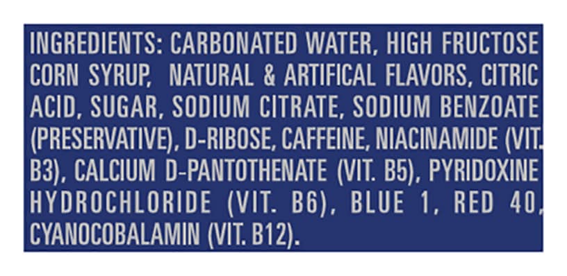 Ingredients: Carbonated Water, High Fructose Corn Syrup, Natural & Artifical Flavors, Citric Acid, Sugar, Sodium Citrate, Sodium Benzoate (Preservative), D-Ribose, Caffeine, Niacinamide (Vit B3), Calcium D-Pantothenate (Vit. B5), Pyridoxine Hydrochloride (Vit. B6), Blue 1, Red 40, Cyanocobalamin (Vit. B12) Contains: Corn