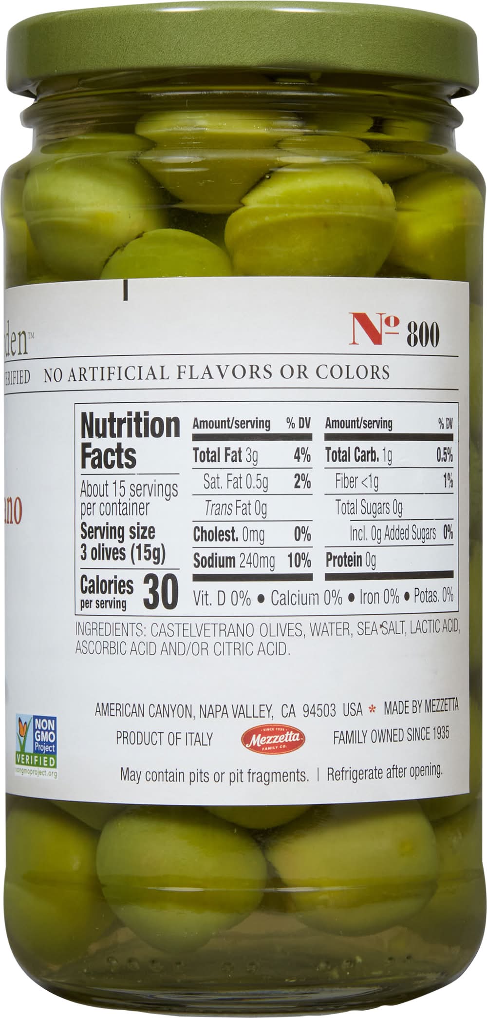 Ingredients: Castelvetrano Olives, Water, Sea Salt, Lactic Acid, Ascorbic Acid and/or Citric Acid