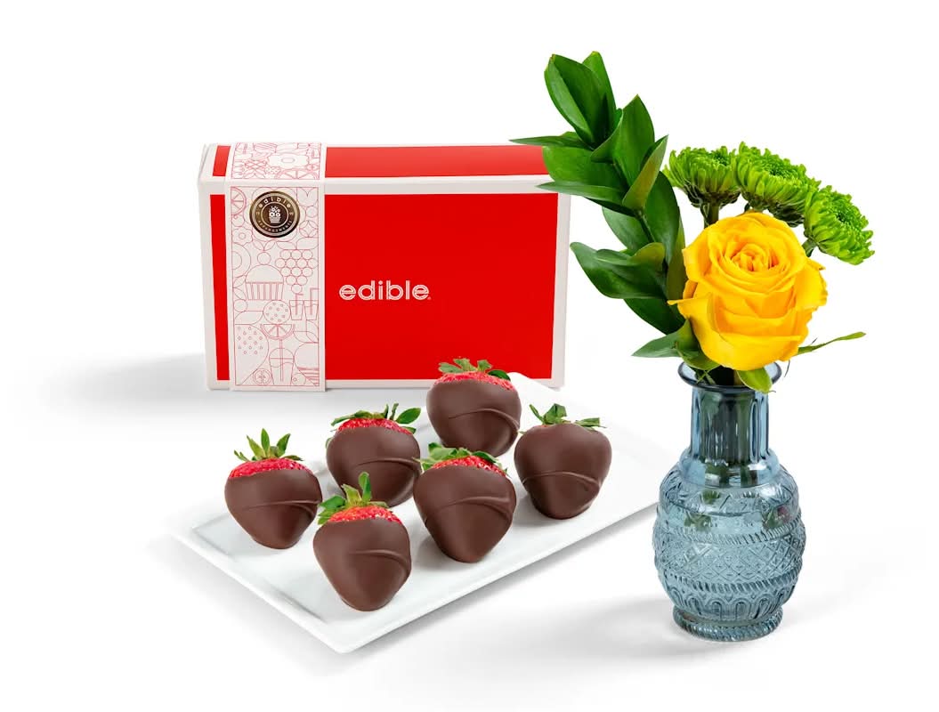Simple but sweet, this combo covers all the bases. Enjoy a 6-count box of our famous strawberries dipped in Edible Signature Chocolate® alongside a mini flower bouquet.