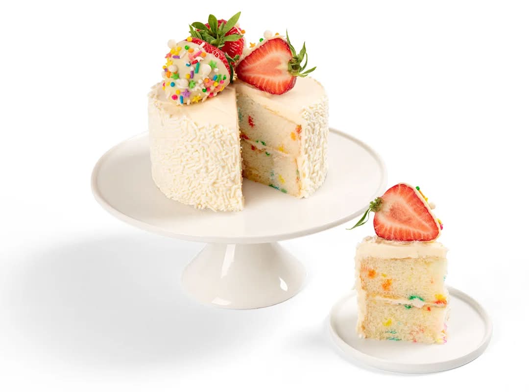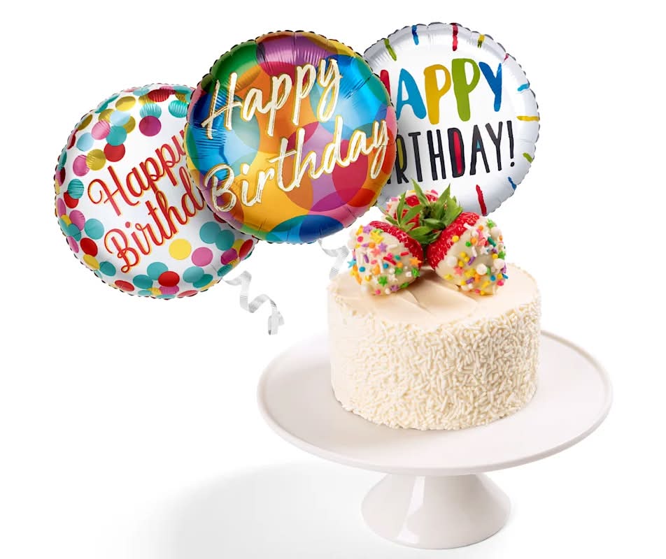 Yell "happy birthday!" to the honorary guest with this burst of celebration. Our vanilla birthday cake topped with your choice of confetti berries or candles is a nothing short of a classic, and paired with our colorful foil balloons, this gift set is sure to bring the party.