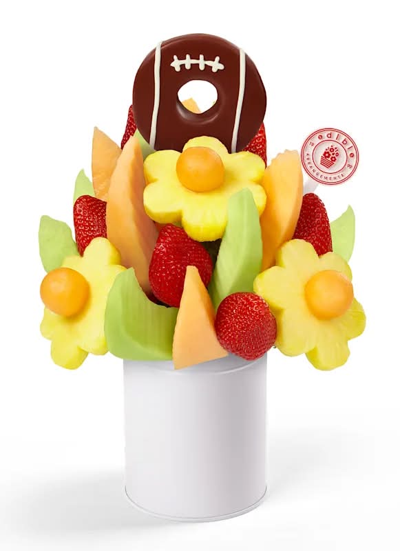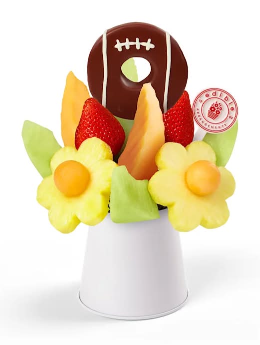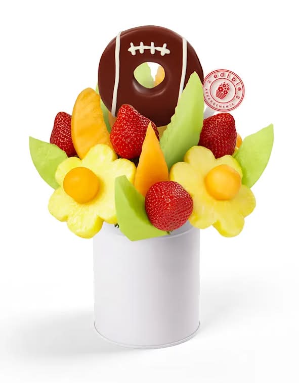 Whether you’re surprising a football fan for their birthday or sharing a game-day treat with friends, this delightful arrangement has everything you need to get them cheering for dessert! Made with a fresh assortment of fruit and a Football Edible® Apple Donut made with chocolate-dipped apple slices, all artfully arranged in a brightly-colored keepsake container, this thoughtful gift has everything you need to win’ em over.