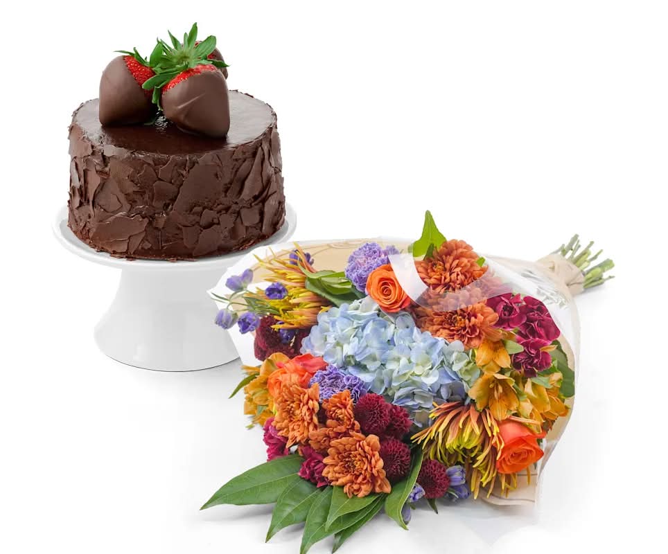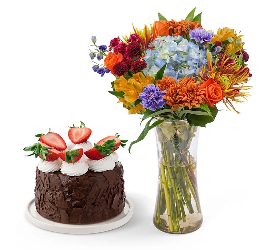 Give your chocolate-lover the perfect duo to celebrate any moment: our chocolate cake with dipped berries or fresh-cut berries and a beautiful floral bouquet. Make your delivery extra special with a glass vase for their flowers.