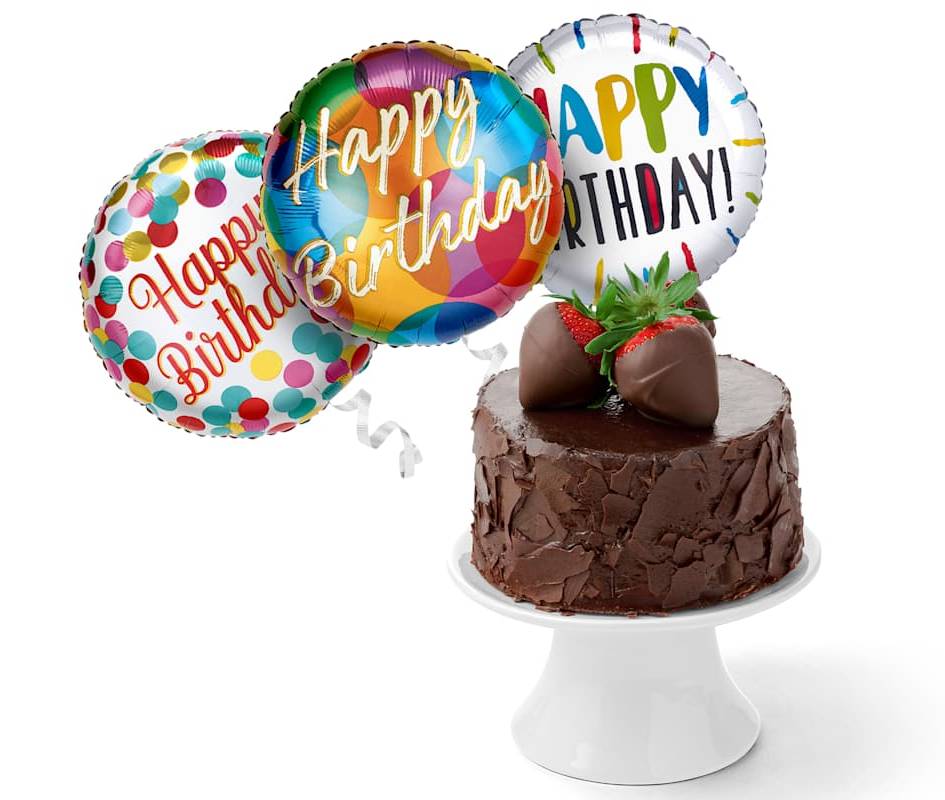 What better way to celebrate the next chapter than with a rich, decadent chocolate cake topped with dipped berries or fresh-cut berries and cream. As if that wasn't enough celebration, we've added in our colorful foil birthday balloons for a real party.
