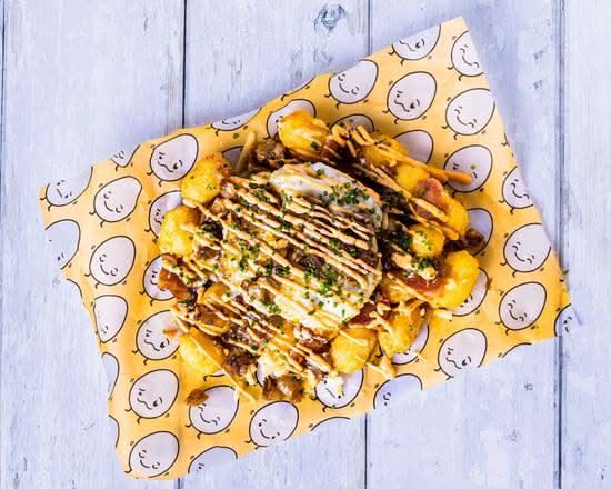 A mound of tater tots, topped with cheese, bacon, grilled onions, chives, a fried egg, and sriracha aioli.