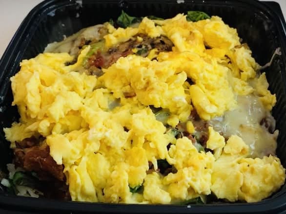 Spinach, mushrooms, bacon, and Swiss cheese. Served with hash browns and 2 buttermilk pancakes, or a slice of French toast or toast.