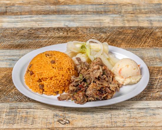 Pork, yellow rice with pigeon peas, potato salad, and tostones