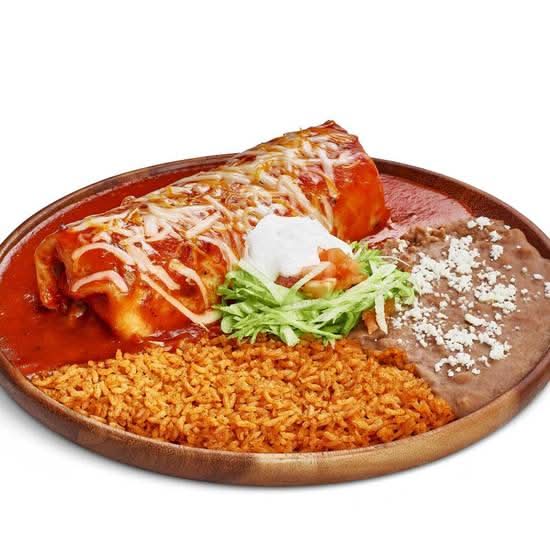 Burrito filled with meat, onions, and cilantro topped with ranchero salsa topped with sour cream, cheese lettuce, and tomato.