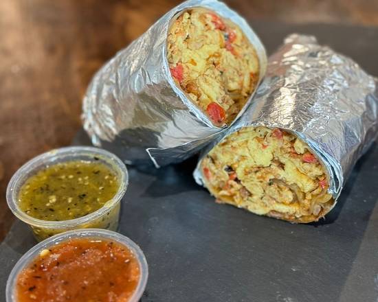 A hearty burrito filled with scrambled eggs, smoky grilled onions, spicy jalapeños, melted cheese, and fresh diced tomatoes, all wrapped in a warm tortilla.