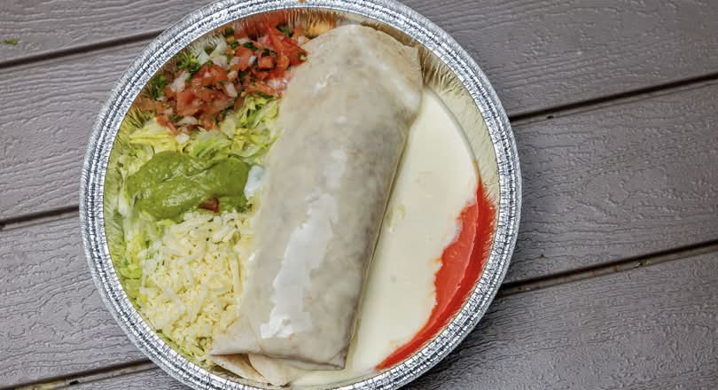 Spicy. Burrito stuffed with your choice of grilled chicken or steak, rice, and beans. Topped with cheese dip and spicy red sauce. Served with guacamole salad, shredded cheese and pico de gallo.