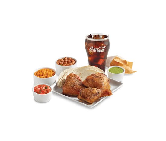 3 pieces of fire-grilled chicken, 2 small sides and tortillas. Includes chips & salsa and drink. Chips and Salsa not included in calories.