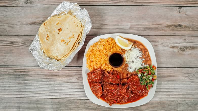 Beef shoulder that's slow-cooked in a fragrant 3-chile sauce with a delicious spice mix. Served dry with rice, beans, salad, and hand-made corn tortillas.