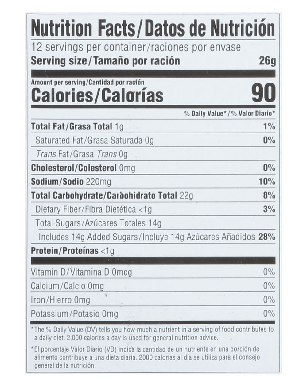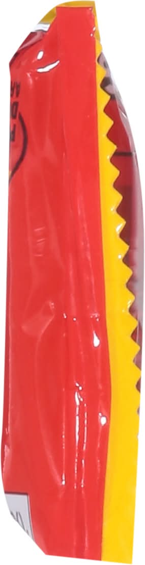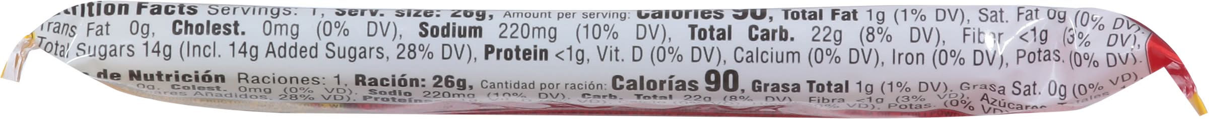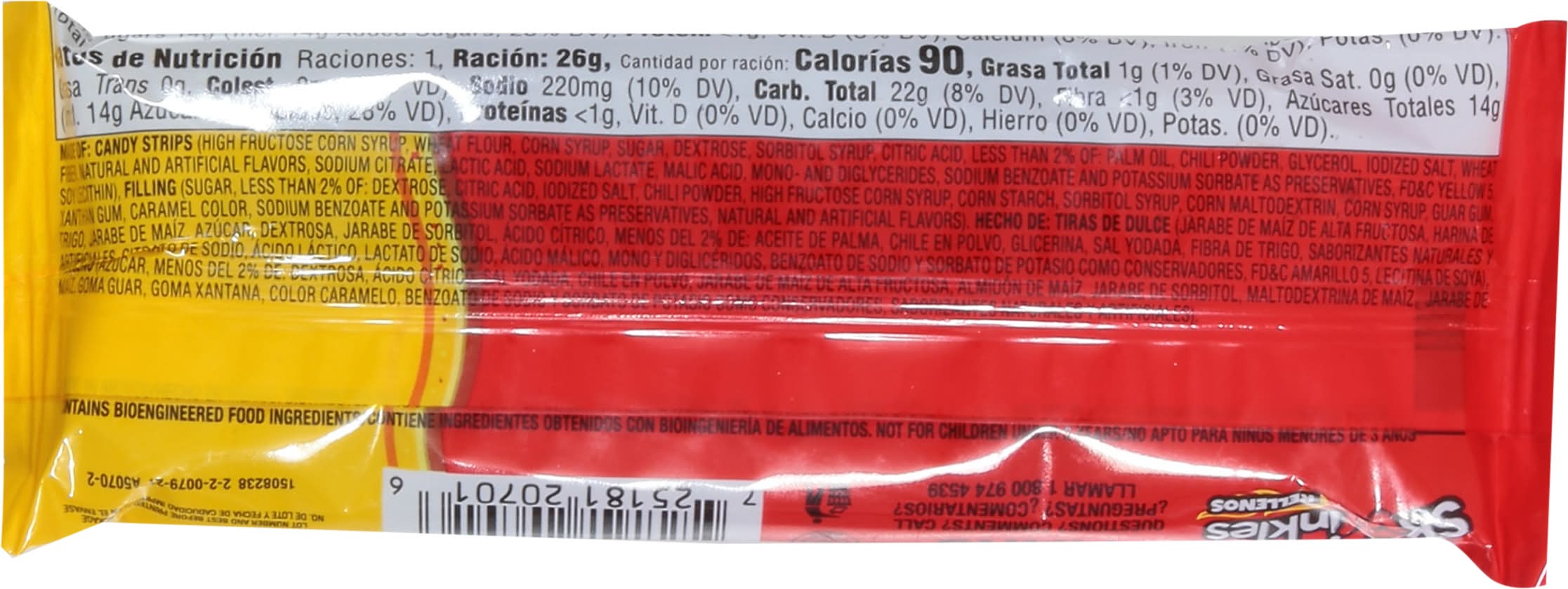 Ingredients: Made of: Candy Strips (High Fructose Corn Syrup, Wheat Flour, Corn Syrup, Sugar, Dextrose, Sorbitol Syrup, Citric Acid, Less than 2% of: Palm Oil, Chili Powder, Glycerol, Idodized Salt, Wheat Fiber, Natural and Artificial Flavors, Sodium Citrate, Lactic Acid, Sodium Lactate, Malic Acid, Mon- and Diglycerides, Sodium Benzoate and Potassium Sorbate as Preservatives, FD&C Yellow 5, Soy Lecithin). Filling (Sugar, Less than 2% of: Dextrose, Citric Acid, Iodized Salt, Chili Powder, High Fructose Corn Syrup, Corn Starch, Sorbitol Syrup, Corn Maltodextrin, Corn Syrup, Guar Gum, Xanthan Gum, Caramel Color, Sodiu Benzoate and Potassium Sorbate as Preservatives, Natural and Artificial Flavors) Contains: Corn, Wheat, Soybeans