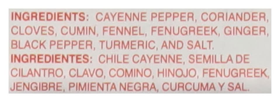 Ingredients: Cayenne Pepper, Coriander, Cloves, Cumin, Fennel, Fenugreek, Ginger, Black Pepper, Turmeric, and Salt