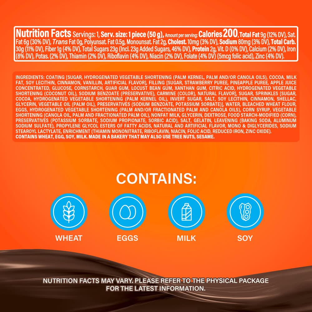 Ingredients: COATING, SUGAR, HYDROGENATED VEGETABLE SHORTENING [PALM KERNEL OIL, PALM OIL AND/OR, CANOLA OIL], COCOA, MILK FAT, SOY LECITHIN, CINNAMON, VANILLIN, ARTIFICIAL FLAVOR, FILLING [SUGAR, STRAWBERRY PUREE, PINEAPPLE PUREE, APPLE JUICE CONCENTRATED, GLUCOSE, CORNSTARCH, GUAR GUM, LOCUST BEAN GUM, XANTHAN GUM, CITRIC ACID, HYDROGENATED VEGETABLE SHORTENING (COCONUT OIL), SODIUM BENZOATE (PRESERVATIVE), CARMINE (COLOR), NATURAL FLAVOR], SUGAR [SUGAR], SPRINKLES, SUGAR, COCOA, HYDROGENATED VEGETABLE SHORTENING (PALM KERNEL OIL), INVERT SUGAR, SALT, SOY LECITHIN, CINNAMON, SHELLAC, GLYCERIN, VEGETABLE OIL (PALM OIL), PRESERVATIVES [SODIUM BENZOATE, POTASSIUM SORBATE], WATER, BLEACHED WHEAT FLOUR, EGGS, HYDROGENATED VEGETABLE SHORTENING [PALM AND/OR FRACTIONATED PALM OIL, CANOLA OIL], CORN SYRUP, VEGETABLE SHORTENING [CANOLA OIL, PALM AND FRACTIONATED PALM OIL], NONFAT MILK, GLYCERIN, DEXTROSE, FOOD STARCH-MODIFIED (CORN), PRESERVATIVES [POTASSIUM SORBATE, SODIUM PROPIONATE, SORBIC ACID], SALT, GELATIN, LEAVENING [BAKING SODA, ALUMINUM SODIUM SULFATE], PROPYLENE GLYCOL ESTERS OF FATTY ACIDS, NATURAL AND ARTIFICIAL FLAVOR, MONO DIGLYCERIDES, SODIUM STEAROYL LACTYLATE, ENRICHMENT [THIAMIN MONONITRATE, RIBOFLAVIN, NIACIN, FOLIC ACID, REDUCED IRON, ZINC OXIDE], . Contains: CONTAINS EGG, MILK, SOY, WHEAT.