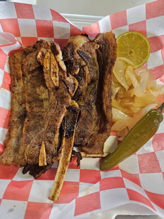 8 oz Costilla de Pecho Thin Sliced Rib Includes (2) Sides: (1) Side of Rice and (1) Side of Frijoles Charros. Grilled Onions, Grilled Chile, Salsas, Sliced Limon and (4) Maiz Tortillas