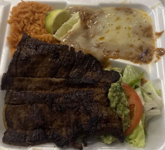 Beef Fajita served with beans sprinkled with Monterrey cheese, fresh salad, grilled onions, and avocado or guacamole.