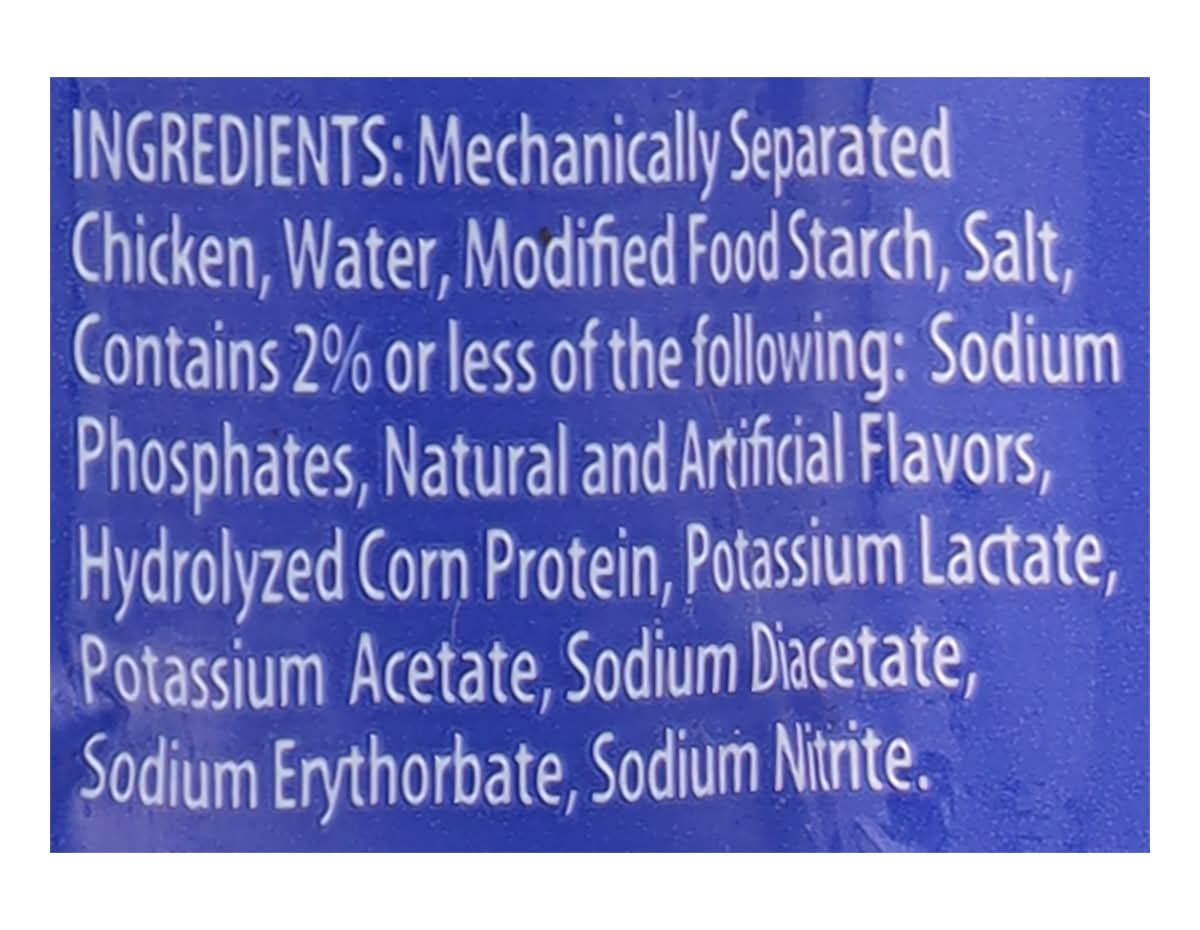 Ingredients: Mechanically Separated Chicken, Water, Modified Food Starch, Salt, Contains 2% or Less of the Following: Sodium Phosphates, Natural and Artificial Flavors, Hydrolyzed Corn Protein, Potassium Lactate, Potassium Acetate, Sodium Diacetate, Sodium Erythorbate, Sodium Nitrite
