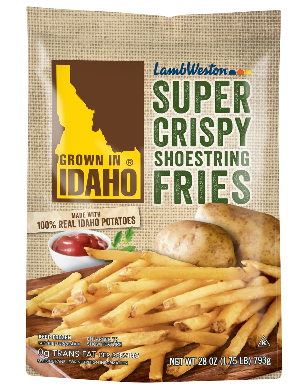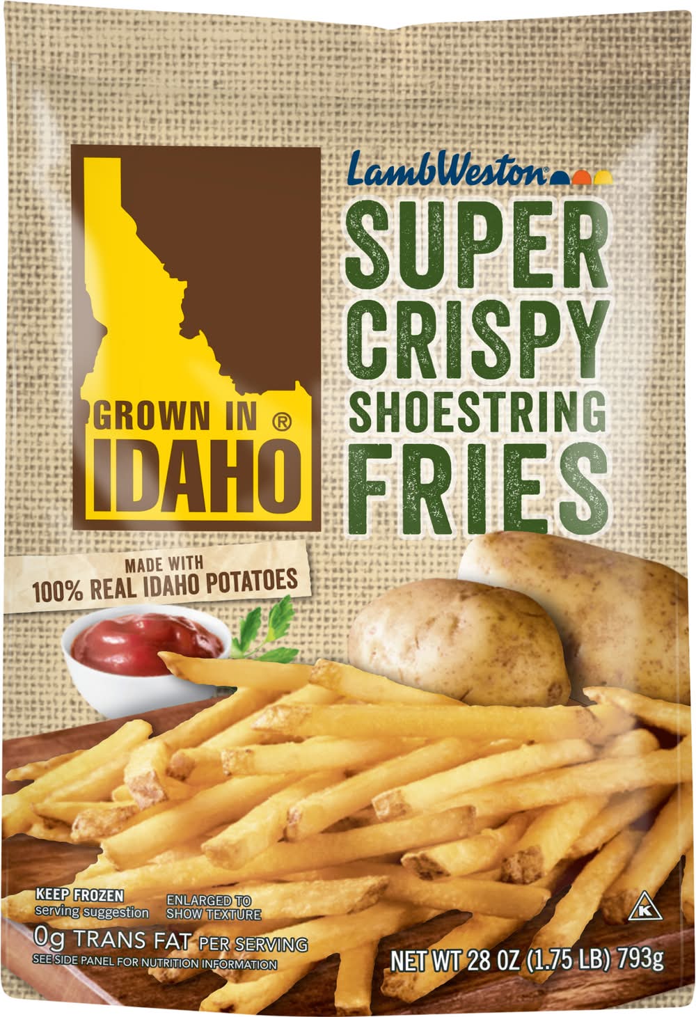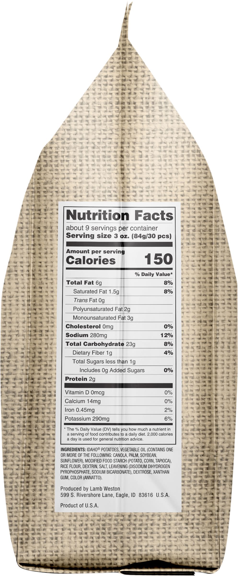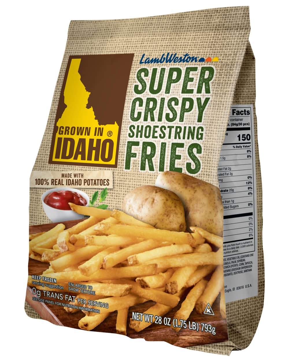 We've used certified Idaho Potatoes to make these delicious, skin-on, super crispy thin, shoestring cut French fries. Enjoy a bite or three and relish in the crispy texture and great flavor of the iconic Idaho spud. Lamb weston, 599 S. Rivershore LaneCity:EagleState/Province:IDZIP:83616Country:U.S.A
