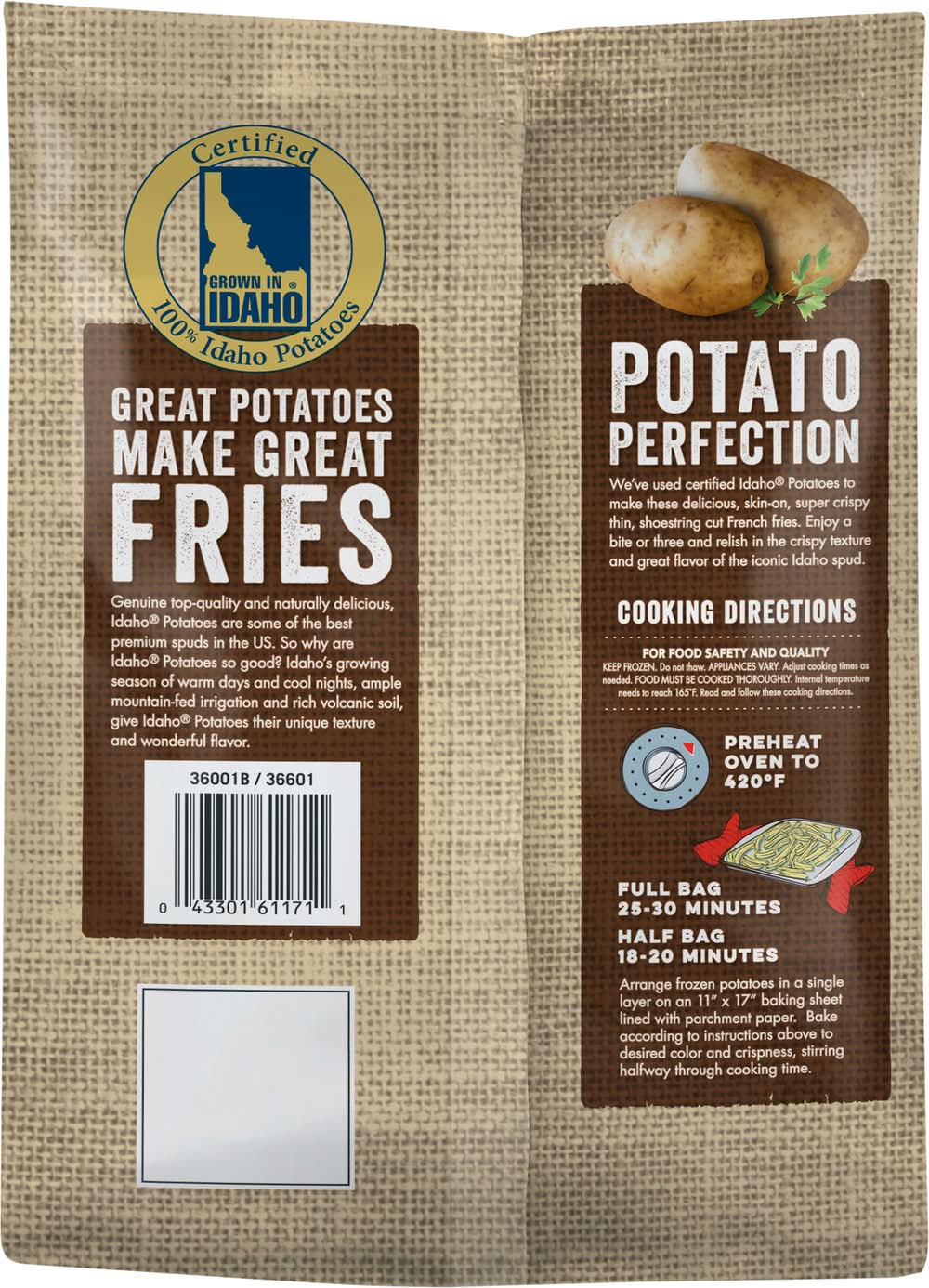 Directions for use: Bake: Cooking Directions: Conventional Oven: 1. Preheat to 425 degrees F. 2. Spread desired quantity of frozen potatoes evenly across an 11 inches x 17 inches baking sheet lined with aluminum foil or parchment paper. 3. Bake according to the chart below; turning potatoes over halfway through the baking time. Full bag 24 - 26 minutes. Half bag 18 - 20 minutes. Air Fryer: 1. Preheat air fryer to 360 degrees F. 2. Fill air fryer basket with half bag of frozen potatoes. 3. Cook for 10- 12 minutes; slide out basket and shake halfway through cooking time. For food safety product must be cooked thoroughly before eating. Keep frozen. Do not thaw read and follow cooking instructions as product must reach a minimum of 165 degrees F (74 degrees C) internal temperature as measured by a food thermometer in several spots appliances vary. Adjust cooking times as needed. Keep frozen. Storage recommendation: Keep frozen.