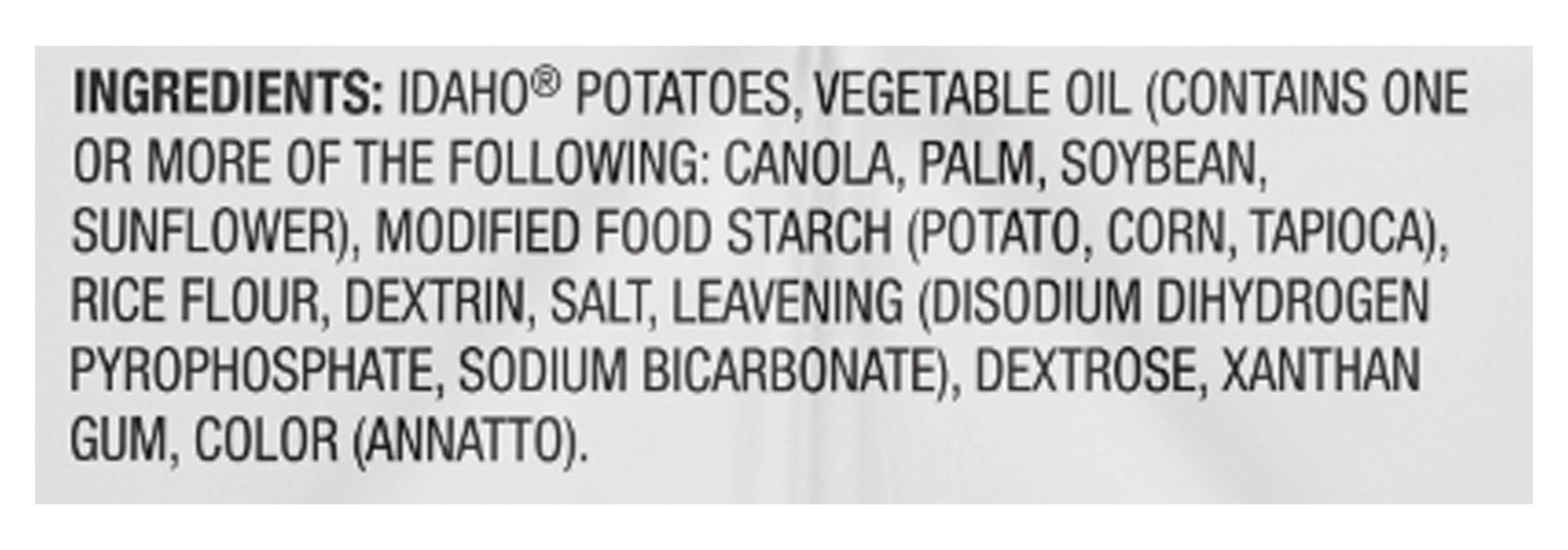 Ingredients: Idaho Potatoes, Vegetable Oil (Contains One or More of the Following: Canola, Palm, Soybean, Sunflower), Modified Food Starch (Potato, Corn, Tapioca), Rice Flour, Dextrin, Salt, Leavening (Disodium Dihydrogen Pyrophosphate, Sodium Bicarbonate), Dextrose, Xanthan Gum, Color (Annatto) Contains: Soybeans