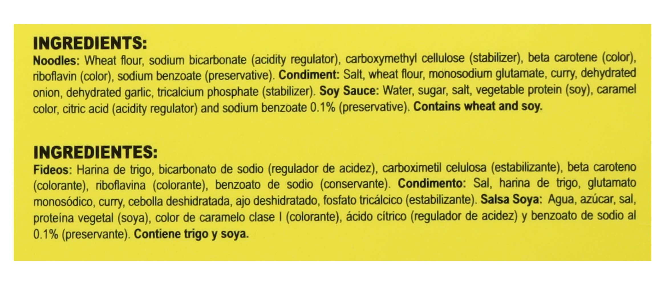 Ingredients: Noodles: Wheat Flour, Sodium Bicarbonate (Acidity Regulator), Carboxymethyl Cellulose (Stabilizer), Beta Carotene (Color), Riboflavin (Color), Sodium Benzoate (Preservative), Condiment: Salt, Wheat Flour, Monosodium Glutamate, Curry, Dehydrated Onion, Dehydrated Garlic, Tricalcium Phosphate (Stabilizer). Soy Sauce: Water, Sugar, Salt, Vegetable Protein (Soy), Caramel Color, Citric Acid (Acidity Regulator) and Sodium Benzoate 0.1% (Preservative) Contains: Wheat, Soybeans