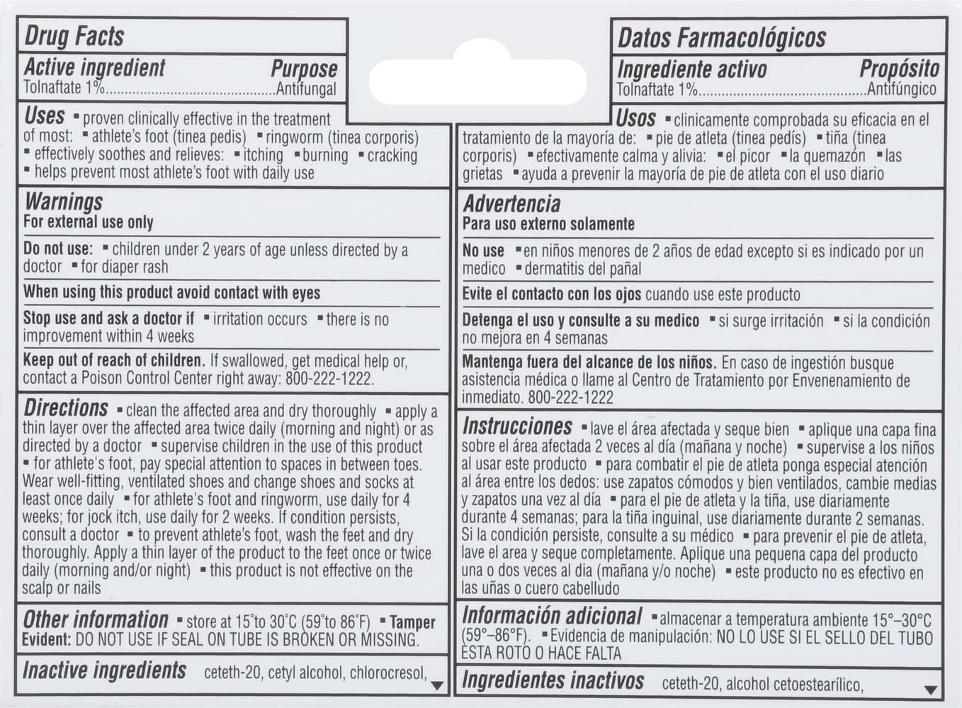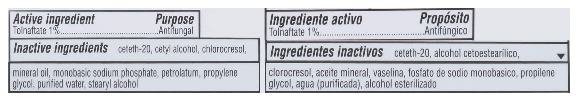 Ingredients: Active Ingredients: Tolnaftate (1%). Purpose: Antifungal. Inactive Ingredients: Ceteth-20, Cetostearyl Alcohol, Chlorocresol, Mineral Oil, Petrolatum, Propylene Glycol, Sodium Phosphate Monobasic, Water (Purified). Additives: Inactive Ingredients: Ceteth-20, Cetostearyl Alcohol, Chlorocresol, Mineral Oil, Petrolatum, Propylene Glycol, Sodium Phosphate Monobasic, Water (Purified).